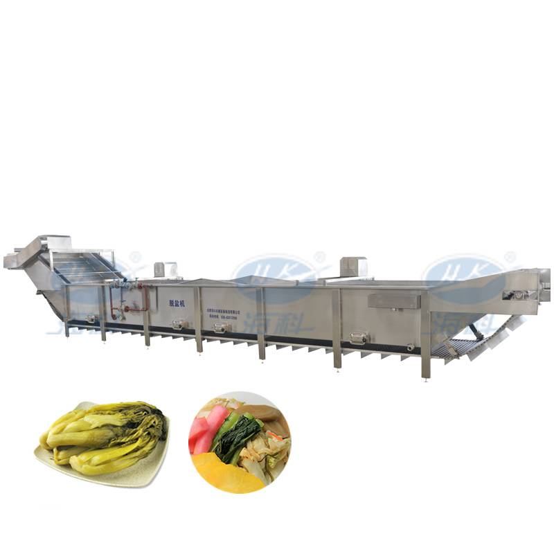 該機是海科在結合用戶的工藝基礎上,吸收國外先進技術,自主創新設計制造的自動化設備,特別適合用于醬菜行業的產品生產;把腌制過得蔬菜如蘿卜、榨菜、青菜等,通過鼓泡、沖浪和漂洗作用把高鹽度的腌制菜清洗干凈,同時也把鹽度降下來。